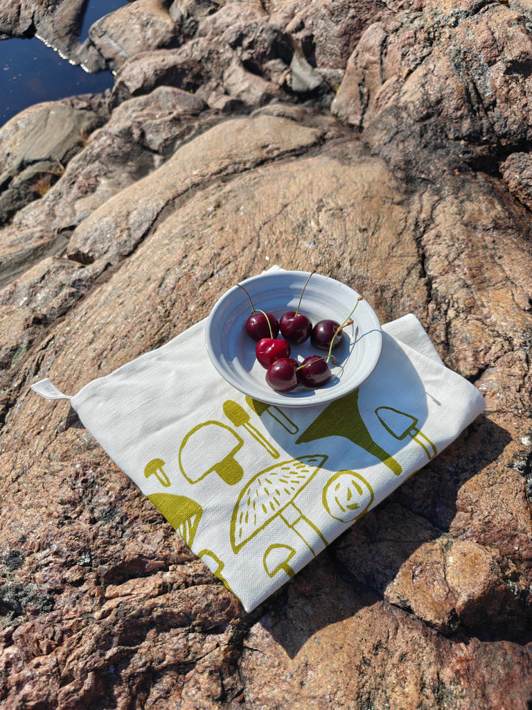 Can you name all the wild forest mushrooms in our Sienet kitchen towel? Finnish illustrator Matti Pikkujämsä painted some of our favorite mushrooms into this pattern.