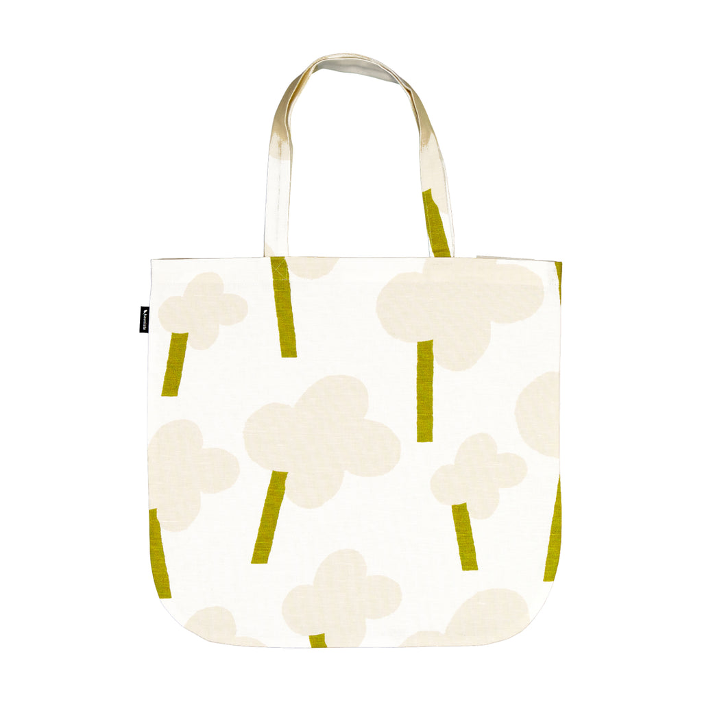 Onni tote bag features a lucky clover print with warm grey leaves and olive green stems. The pattern is designed by Finnish textile artist Hannele Äijälä. The bag is made of durable linen & cotton mix fabric and the handles have extra stitching for added strength.