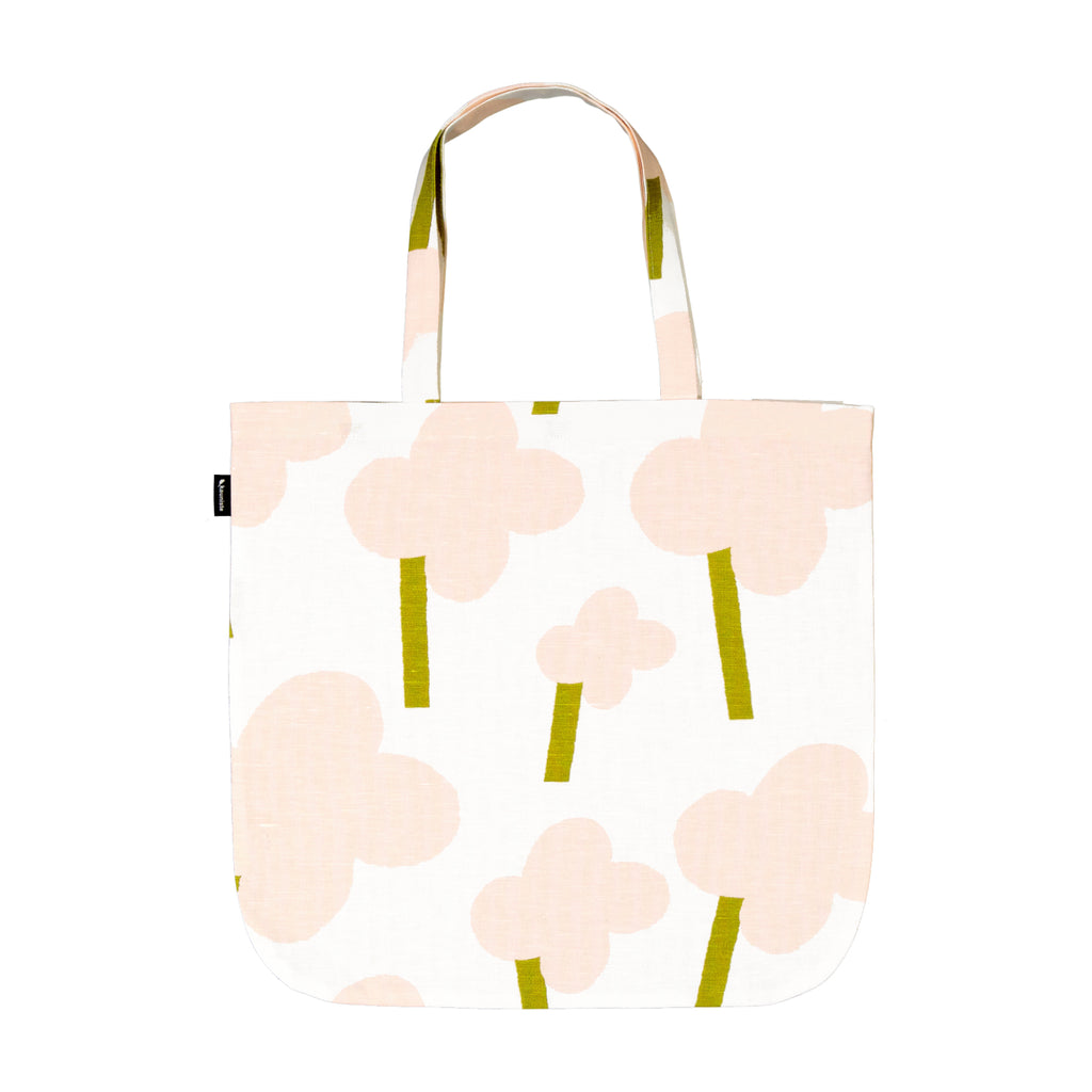 Onni tote bag features a lucky clover print with light pink leaves and olive green stems. The pattern is designed by Finnish textile artist Hannele Äijälä. The bag is made of durable linen & cotton mix fabric and the handles have extra stitching for added strength.