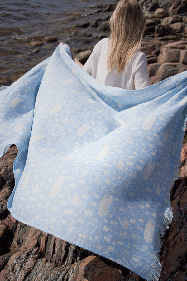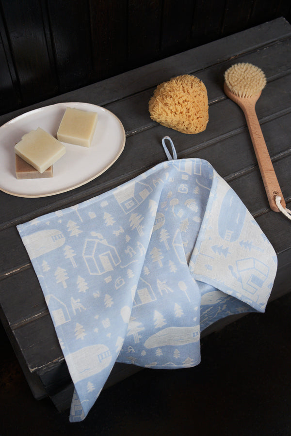 Welcome to Finnish sauna! The soft woven sauna textiles are perfect for cooling down after the relaxing hot sauna - these textiles are lightweight and dry fast. The pattern features idyllic Finnish sauna house by the lake and surrounded by forests.